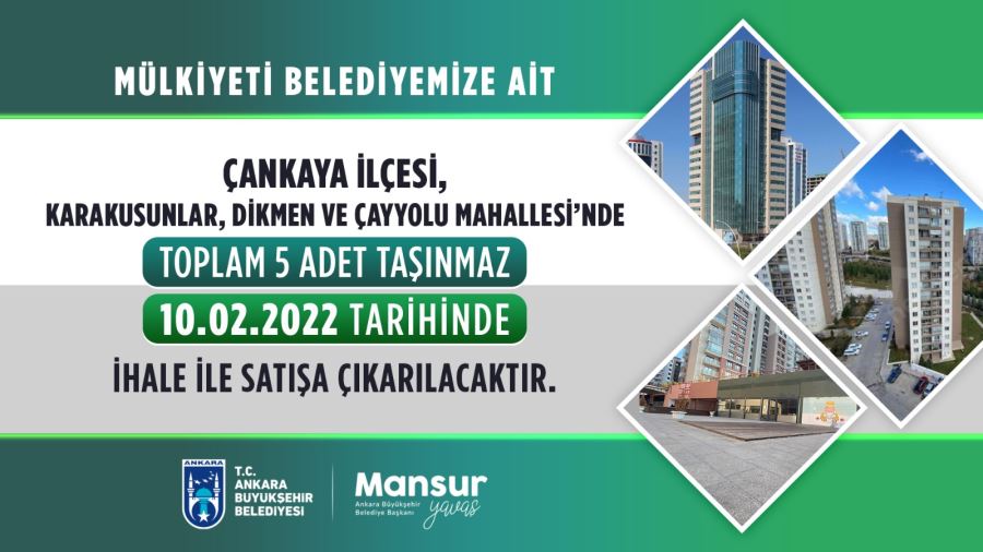 Emlak ve İstimlak Daire Başkanlığı, Kızılırmak-Karakusunlar Mahallesi’nde yer alan 11 daireyi 3 Şubat 2022’de, aynı mahallede bulunan 1 mağaza, Dikmen’de 1 mesken, Çayyolu’nda ise 3 dükkândan oluşan taşınmazlarını da 10 Şubat 2022’de kapalı zarf usulüyle gerçekleştirilecek ihalelerle satışa sunacak.